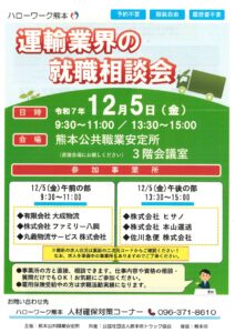 この度、ハローワーク熊本が主催する「運輸業界の就職相談会」への参加が決定いたしました。